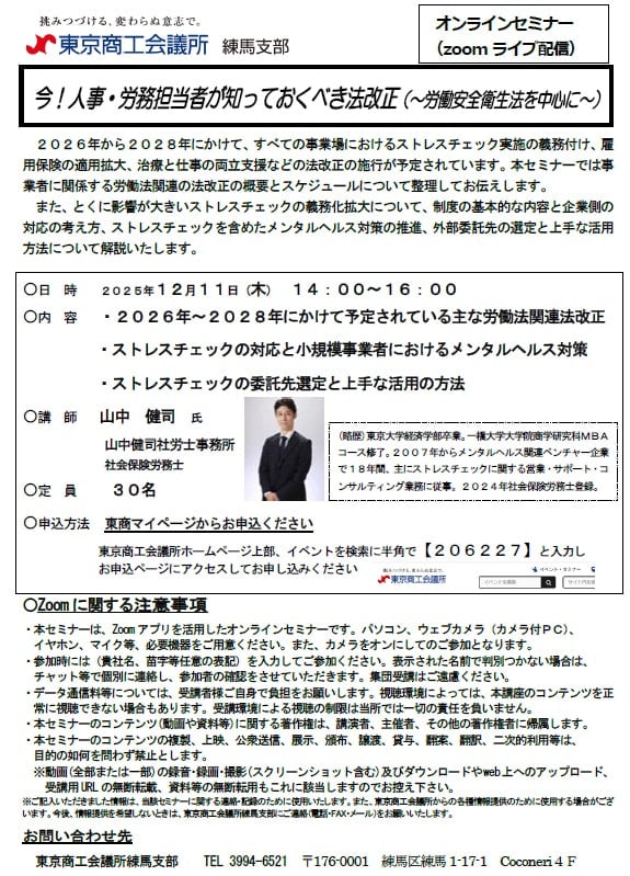 令和7年12月11日㈫東京商工会議所練馬支部との共催セミナー『今!人事・労務担当者が知っておくべき法改正(~労働安全衛生法を中心に~)』開催のお知らせ